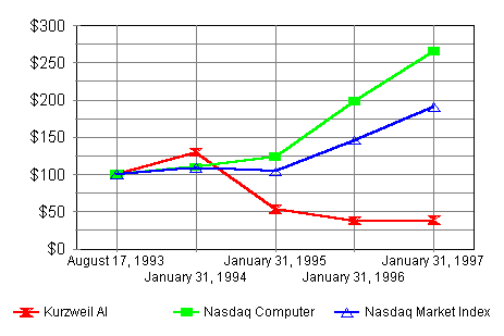 January 31, 1996 January 31, 1997 Kurzweil Applied Intelligence, Inc $100.00 $130.00 $53.00 $38.00 $38.75 Nasdaq Computer & Data Processing Service Stocks $100.00 $110.00 $124.00 $198.00 $265.00 Nasdaq Market Index $100.00 $109.00 $104.00 $146.00 $191.00